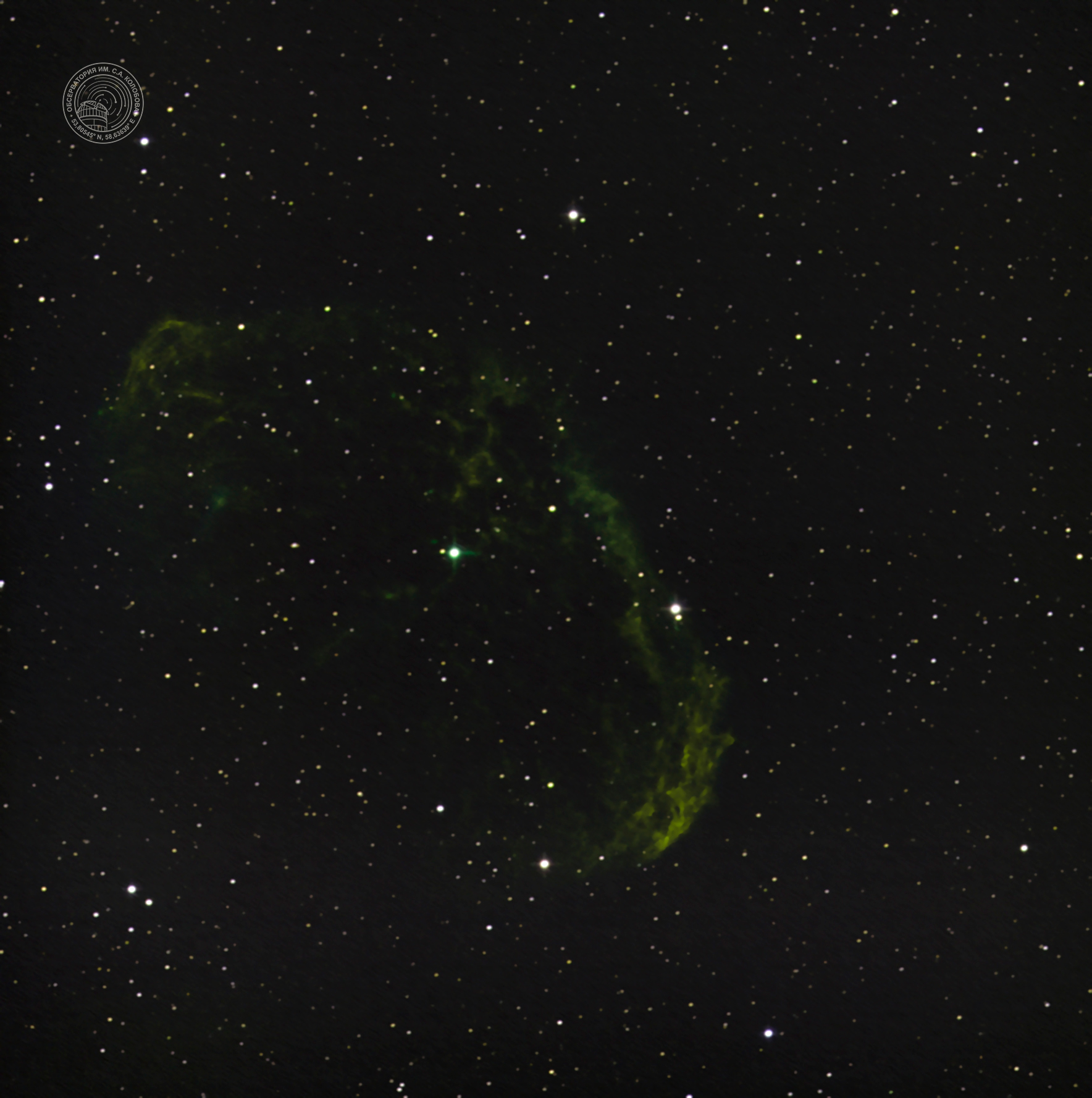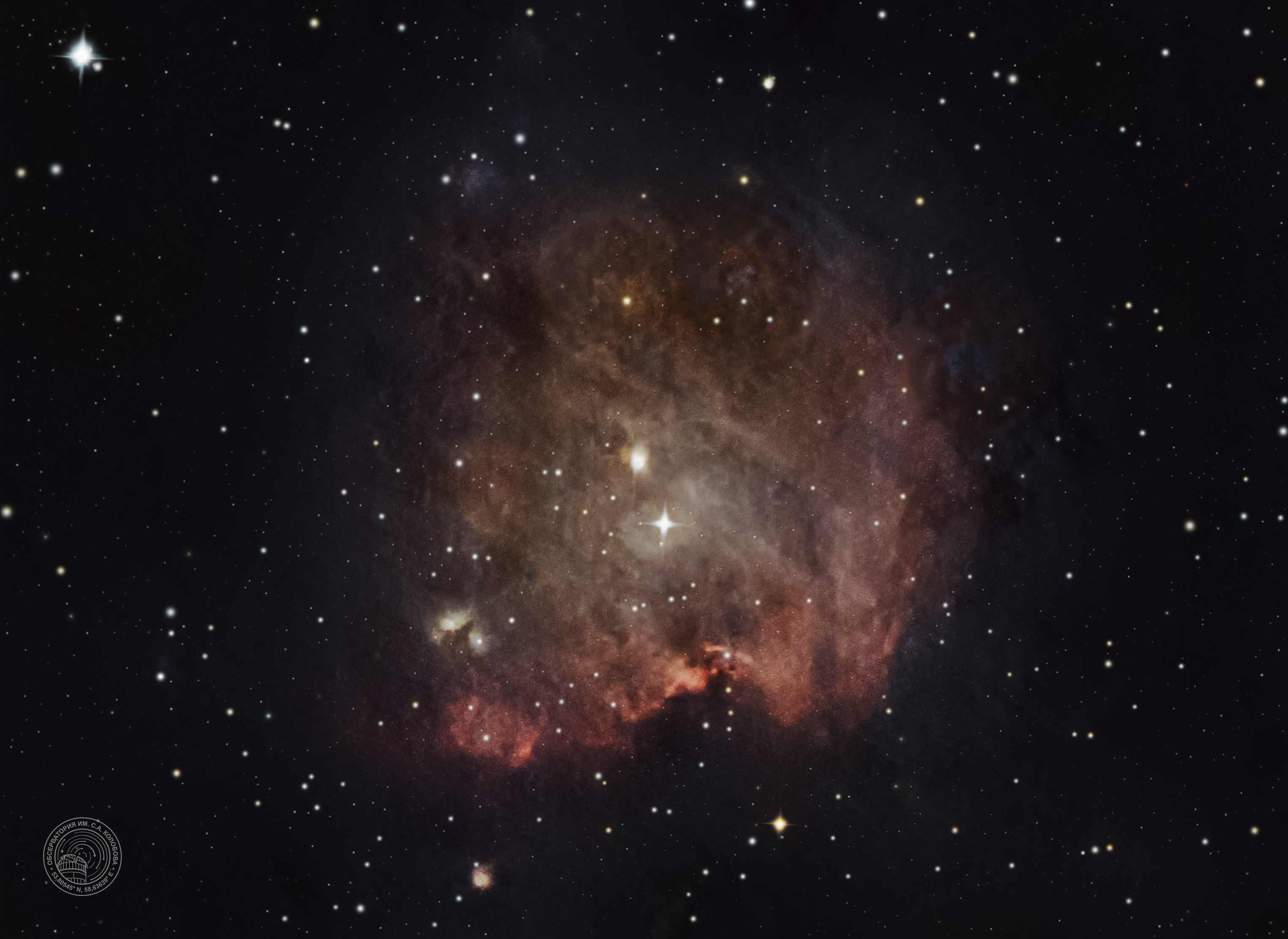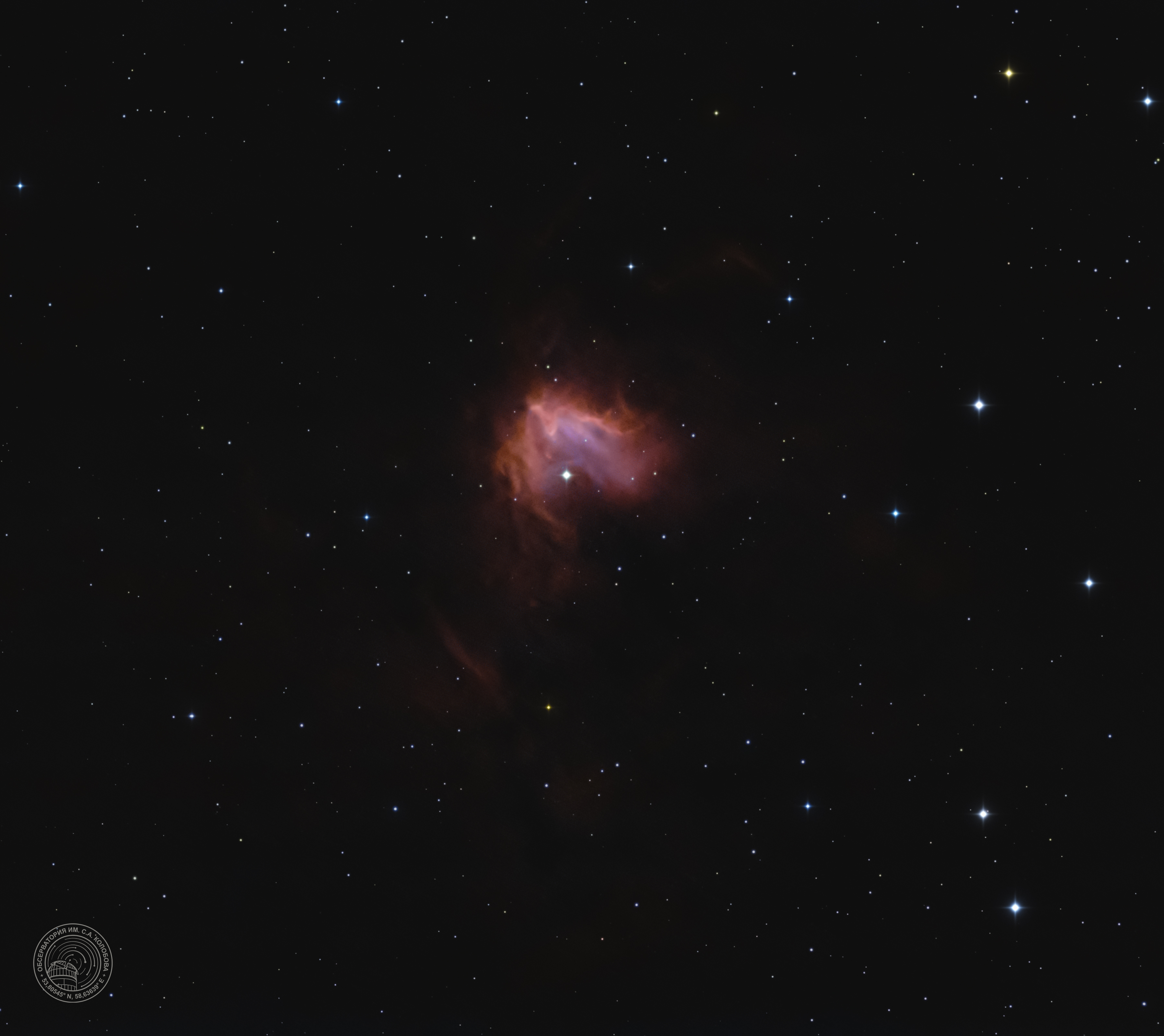 The "Fossil Footprint" Nebula NGC 1491 — an emission nebula in the constellation Perseus. The image was captured on 17.09.2025 at the S. A. Kolobov Observatory using an ASTROSIB RC500 telescope on an ASTROSIB AVM-700 mount with an SBIG Aluma AC4040-Ultimate (C2) astrocamera. HSO filters were used, with a total exposure of 74 minutes.