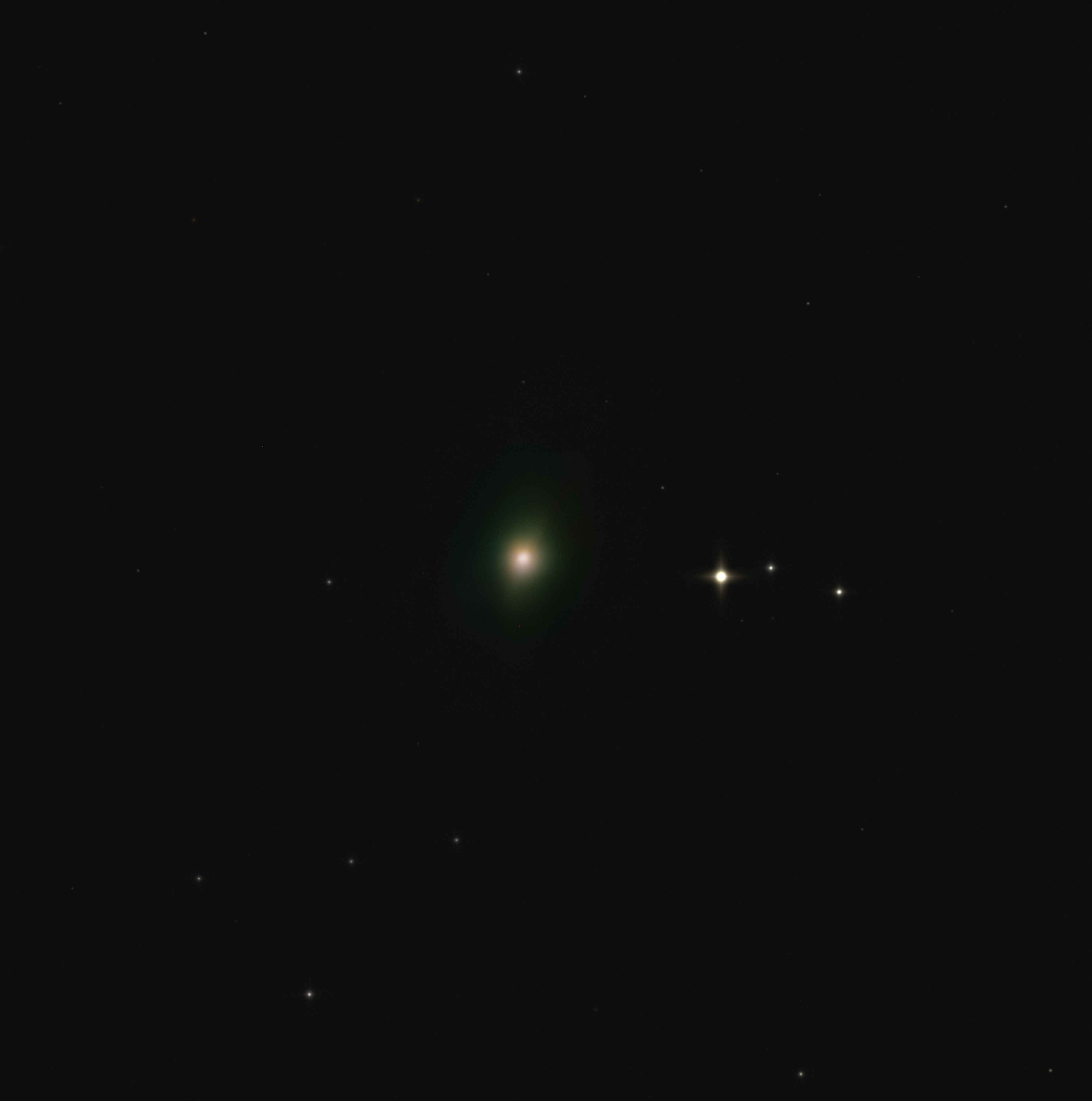 Comet C/2025 R2 (SWAN) — a long-period and dynamically old comet that arrived from the distant outskirts of the Solar System. The image was captured on 03.11.2025 at the S. A. Kolobov Observatory using an ASTROSIB RC500 telescope on an ASTROSIB AVM-700 mount with an SBIG Aluma AC4040-Ultimate (C2) astrocamera. An LRGB filter set was used, with a total exposure of 62.5 minutes.