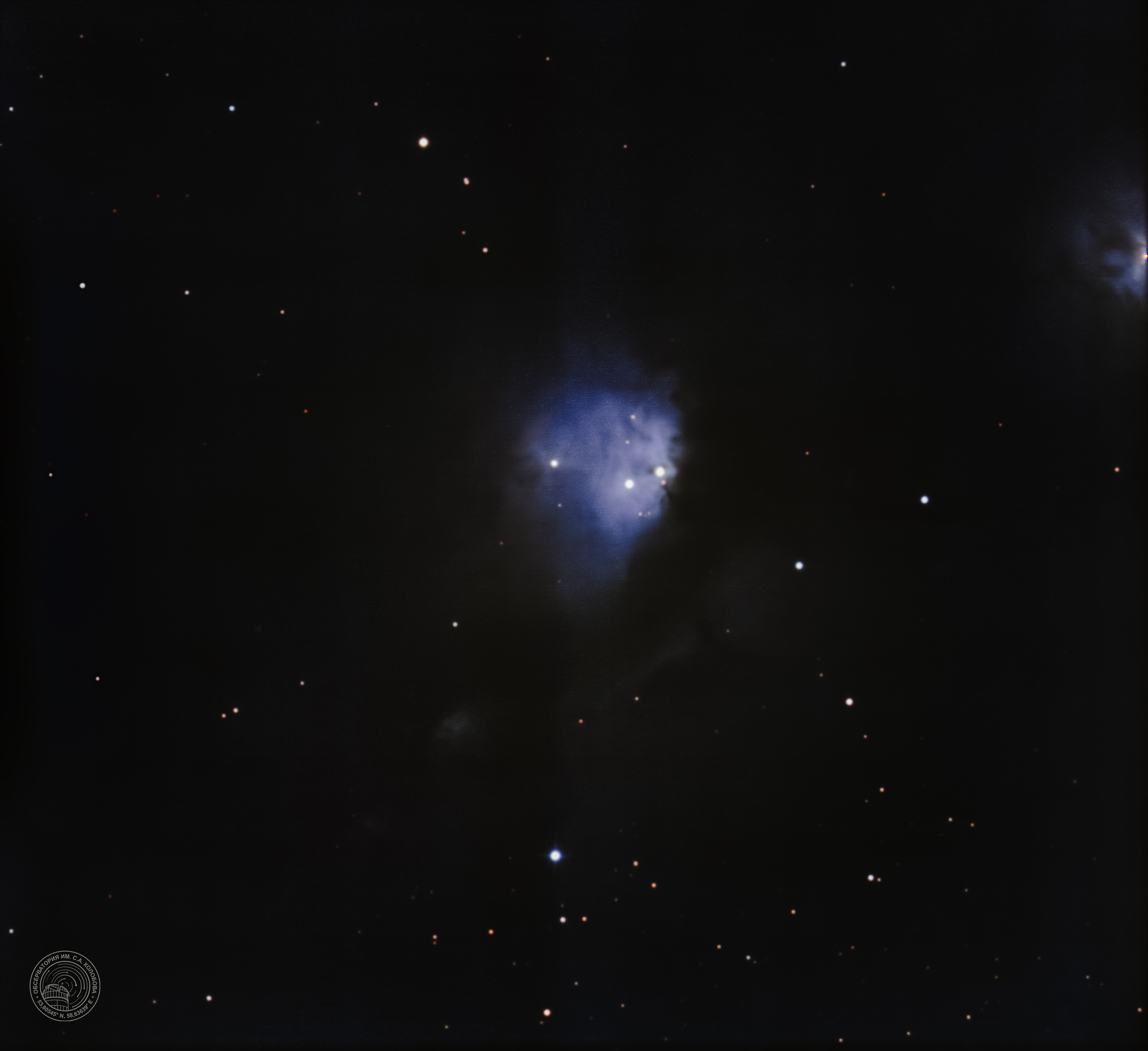 The "Friendly Ghost Casper" Nebula M 78 (NGC 2068) — a reflection nebula observed in the constellation Orion, located 1350–1600 light-years away. The image was captured on 27.11.2024 at the S. A. Kolobov Observatory using an ASTROSIB RC500 telescope on an ASTROSIB AVM-700 mount with an SBIG Aluma AC4040-Ultimate (C2) astrocamera. RGB filters were used, with a total exposure of 70 minutes.