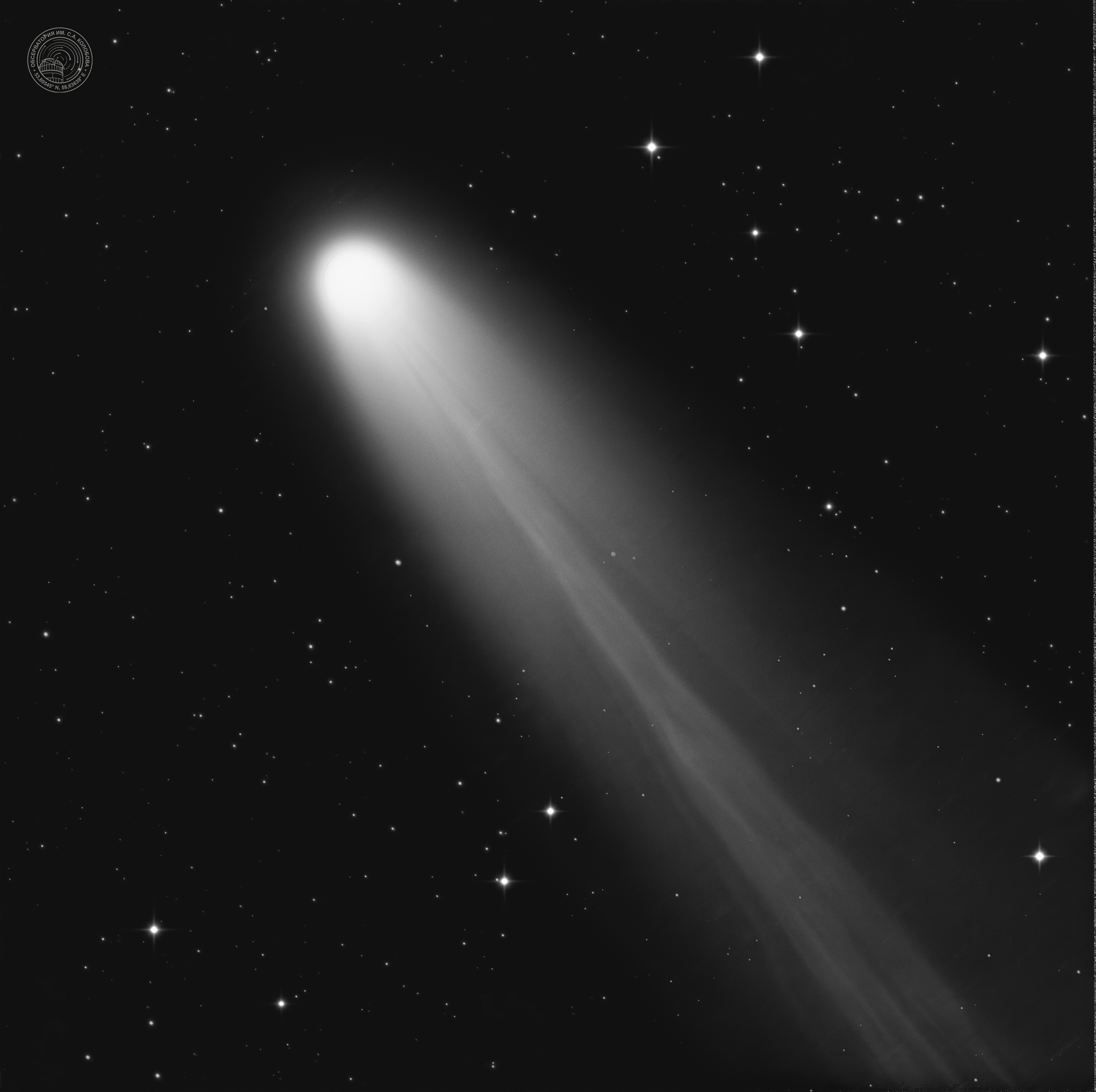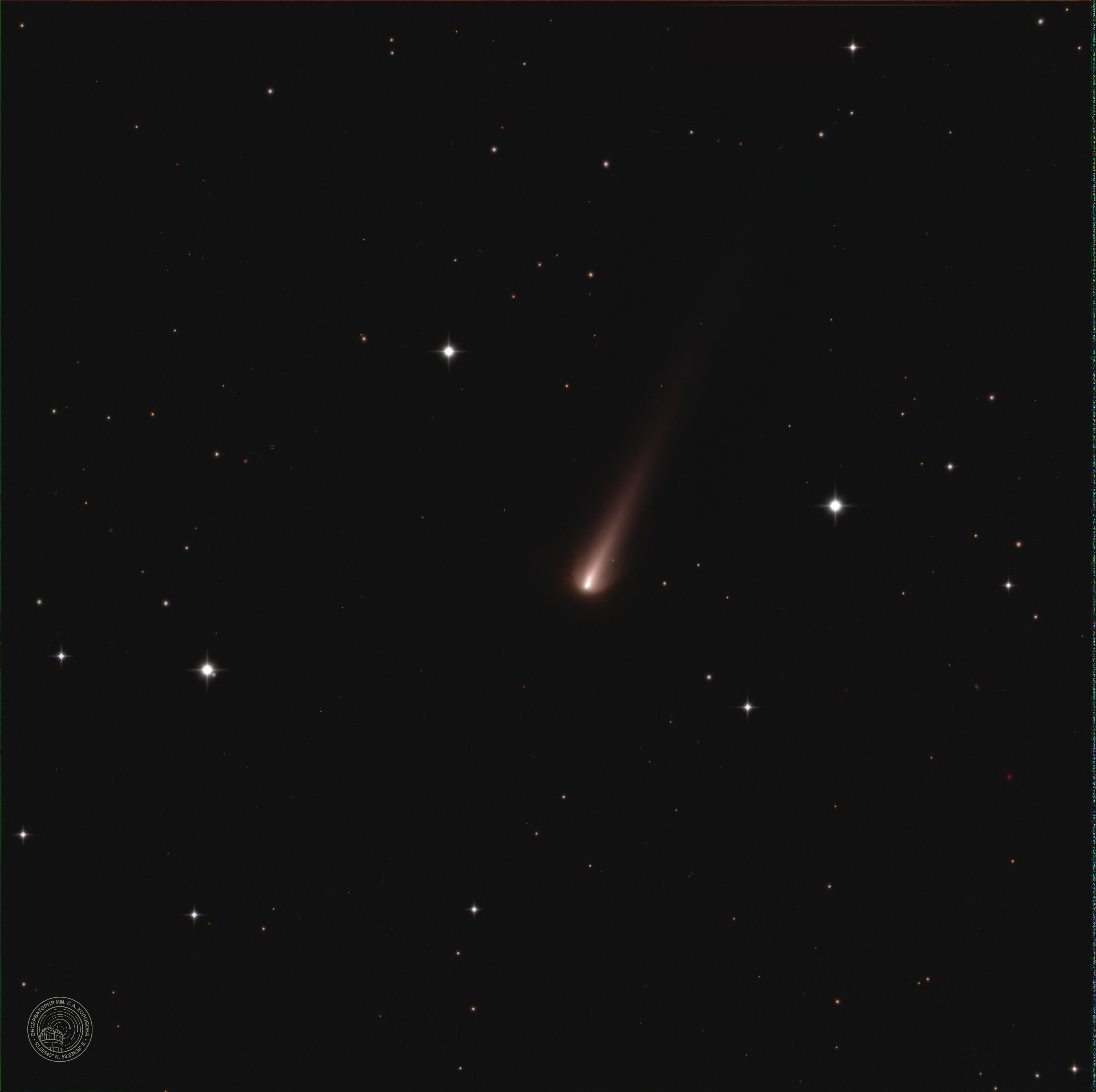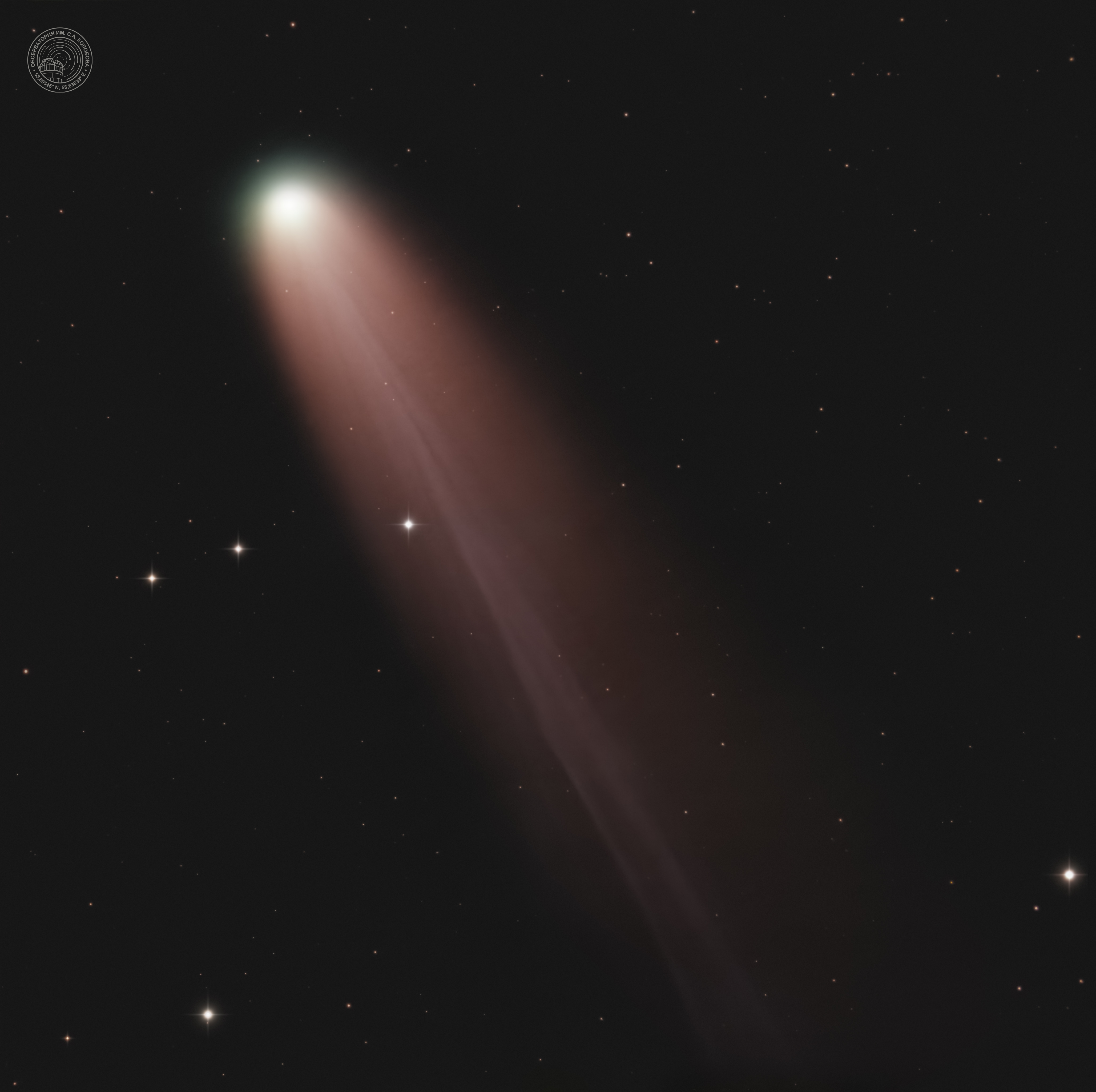 Comet 3I/ATLAS (C/2025 N1) — an interstellar comet discovered on July 1, 2025, by the ATLAS station. The image was captured on 15.11.2025 between 6 and 7 a.m. at the S. A. Kolobov Observatory using an ASTROSIB RC500 telescope on an ASTROSIB AVM-700 mount with an SBIG Aluma AC4040-Ultimate (C2) astrocamera. LRGB filters were used, with a total exposure of 60 minutes.