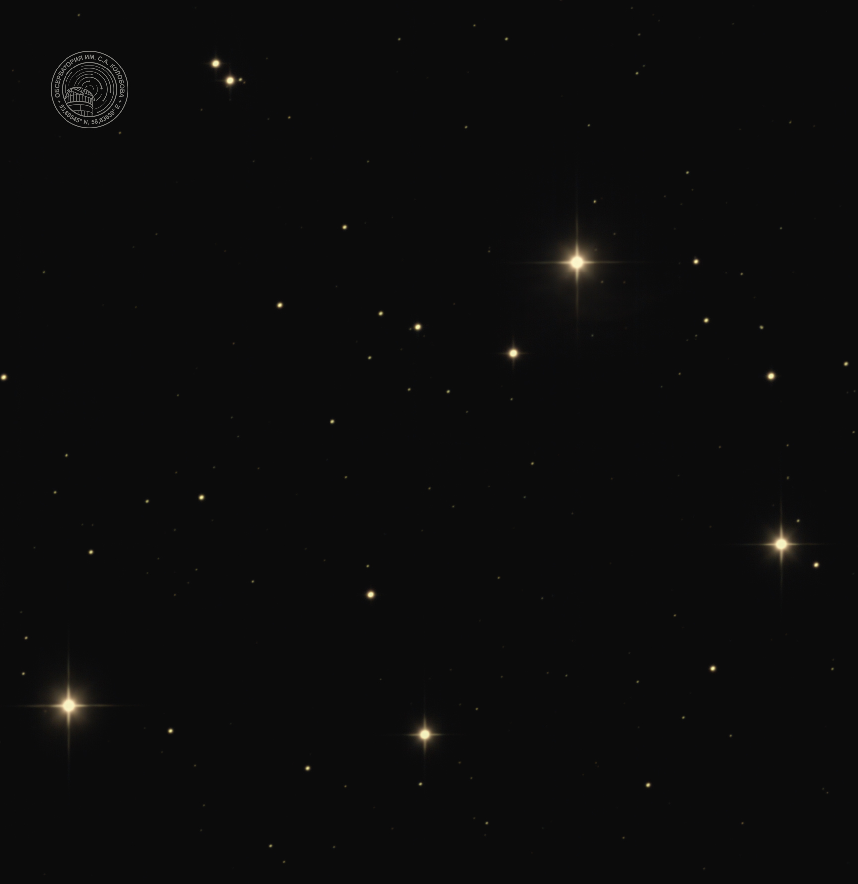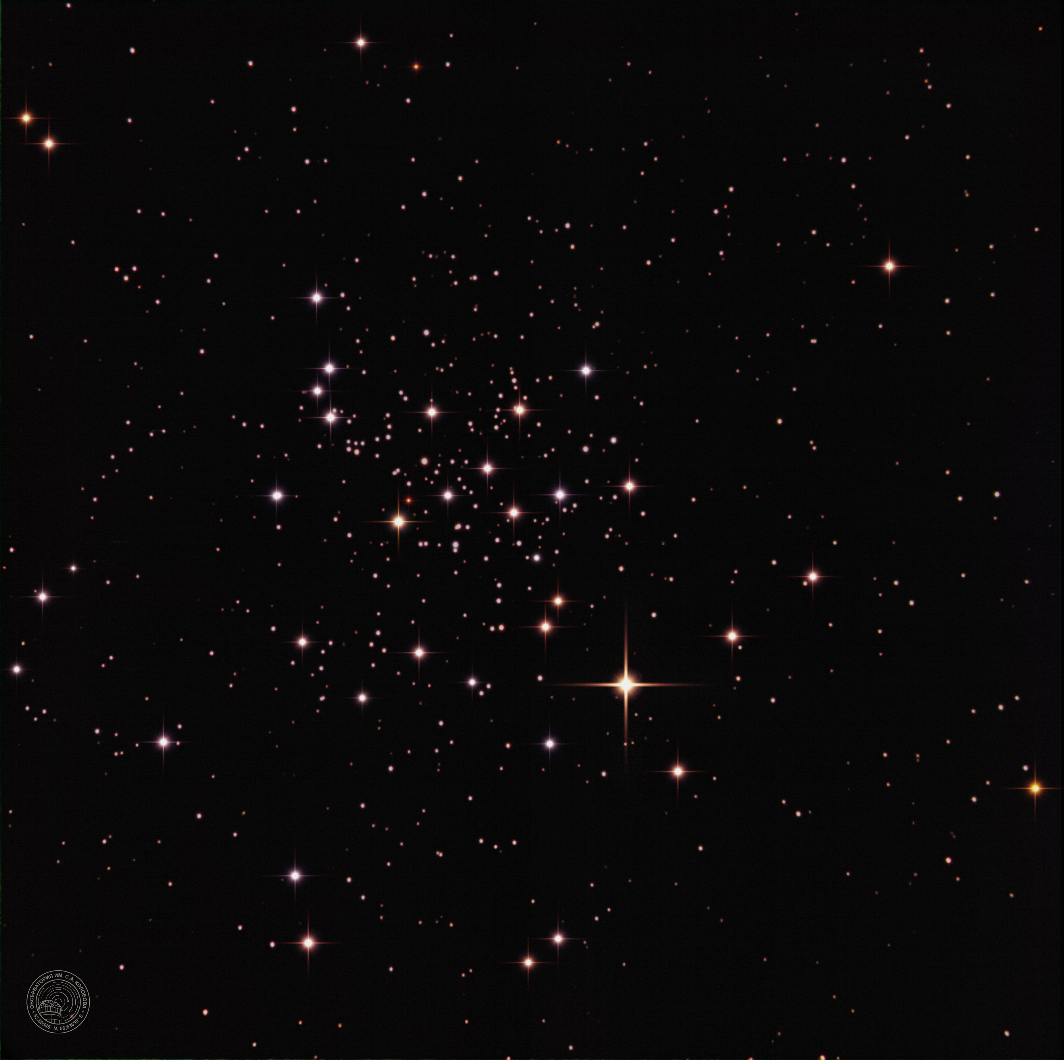 Star cluster M 67 (Golden Eye, Royal Cobra). An open star cluster in the constellation Cancer. The image was captured on 27.02.2025 at the S. A. Kolobov Observatory using an ASTROSIB RC500 telescope on an ASTROSIB AVM-700 mount with an SBIG Aluma AC4040-Ultimate (C2) astrocamera. RGB filters were used, with a total exposure of 900 seconds.
