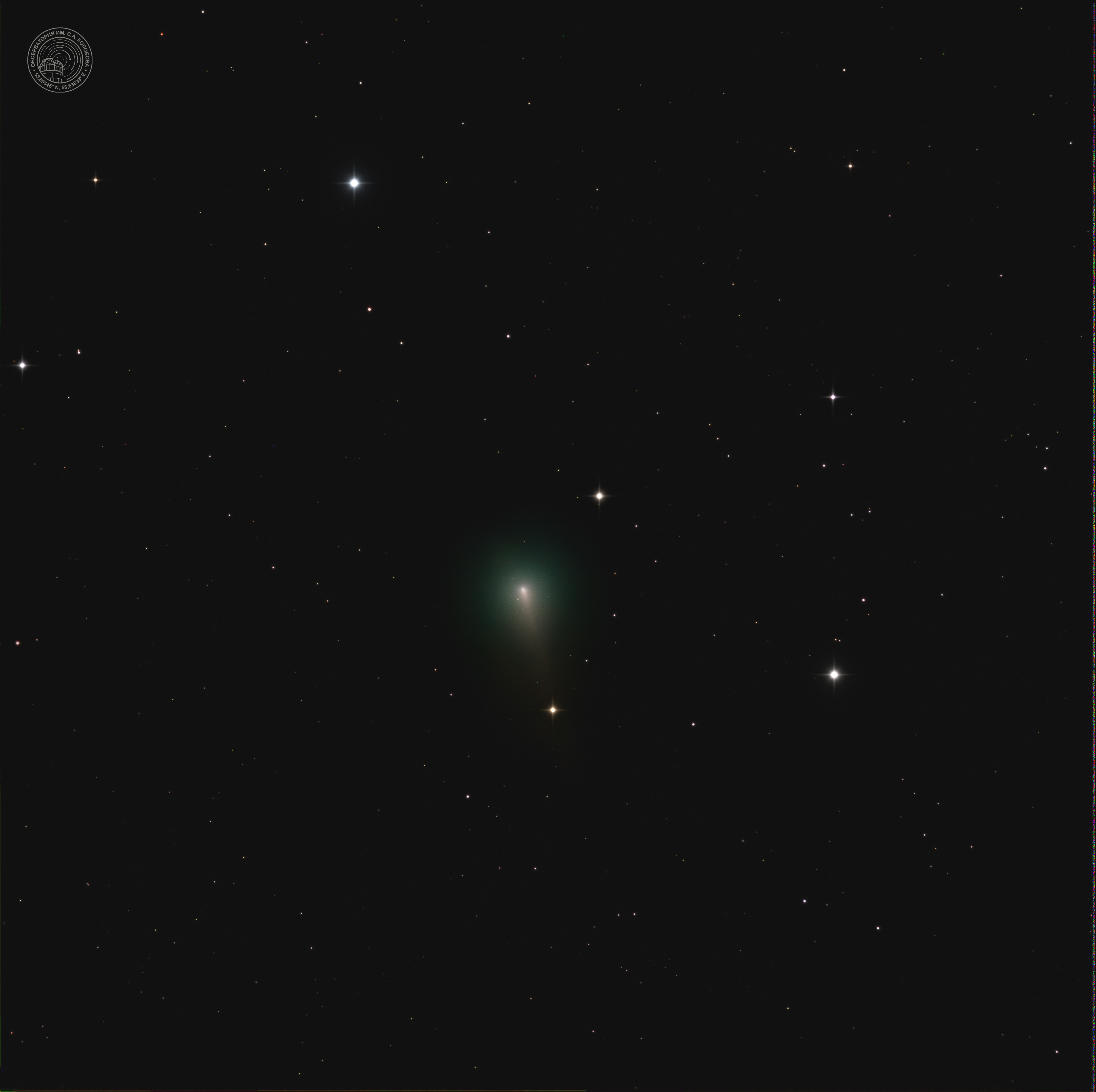 Comet C/2025 K1 (ATLAS) A non-periodic comet, first spotted in May 2025. As it moved away from the Sun in November 2025, the comet disintegrated into several fragments, and fragments A+B+C may be ejected from the Solar System. The image was captured on 15.11.2025 at the S. A. Kolobov Observatory using an ASTROSIB RC500 telescope on an ASTROSIB AVM-700 mount with an SBIG Aluma AC4040-Ultimate (C2) astrocamera. The following filters were used: L 30×20″, R 5×20″, G 5×20″, B 5×20″, with a total exposure of 15 minutes.