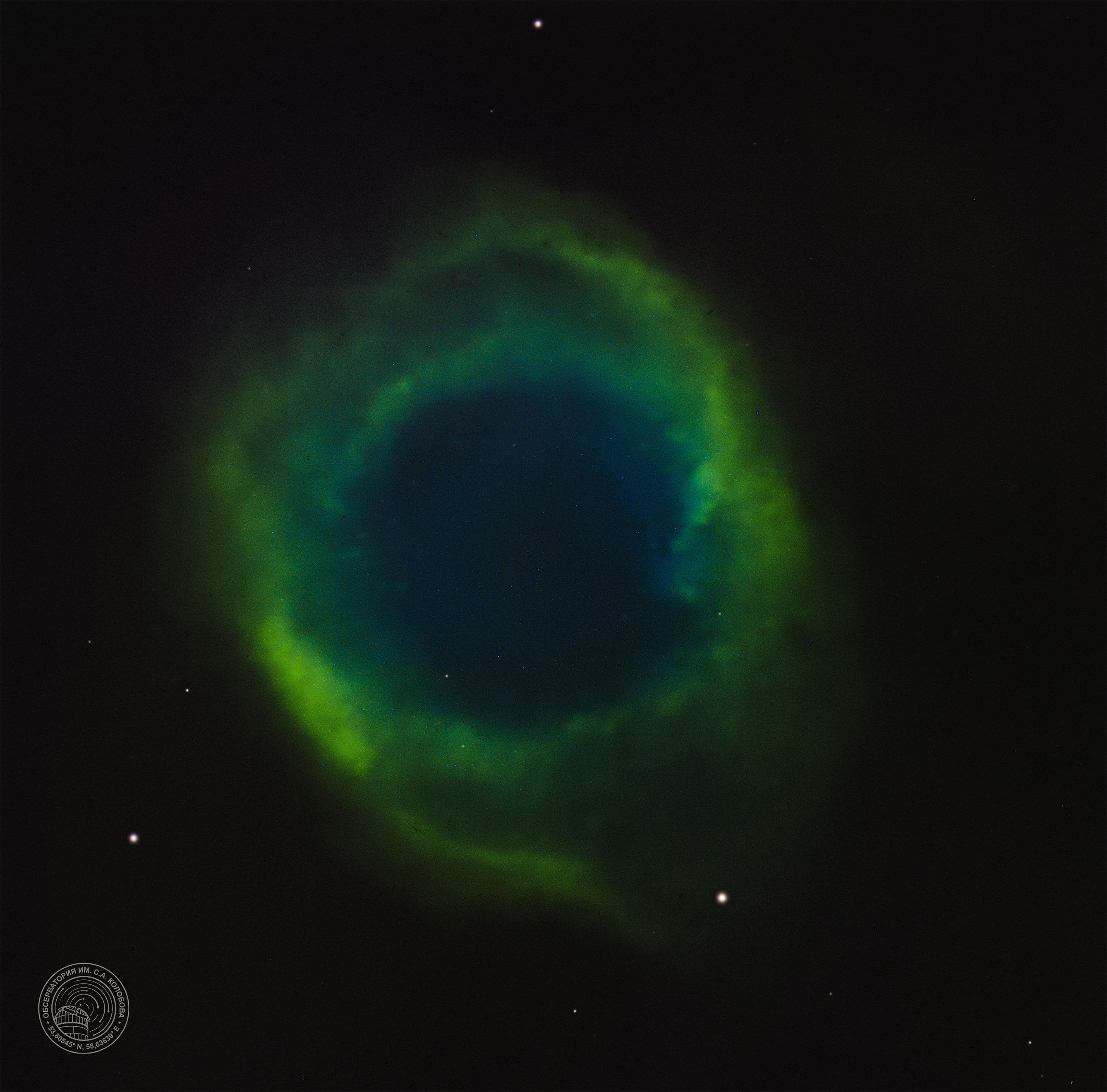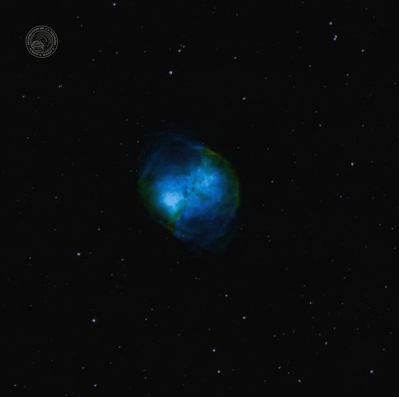 The Helix Nebula (NGC 7293) — a planetary nebula in the constellation Aquarius at a distance of 650 light-years from the Sun. The image was captured on 30.09.2024 at the S. A. Kolobov Observatory using an ASTROSIB RC500 telescope on an ASTROSIB AVM-700 mount with an SBIG Aluma AC4040-Ultimate (C2) astrocamera. HSO filters were used, with a total exposure of 96 minutes.