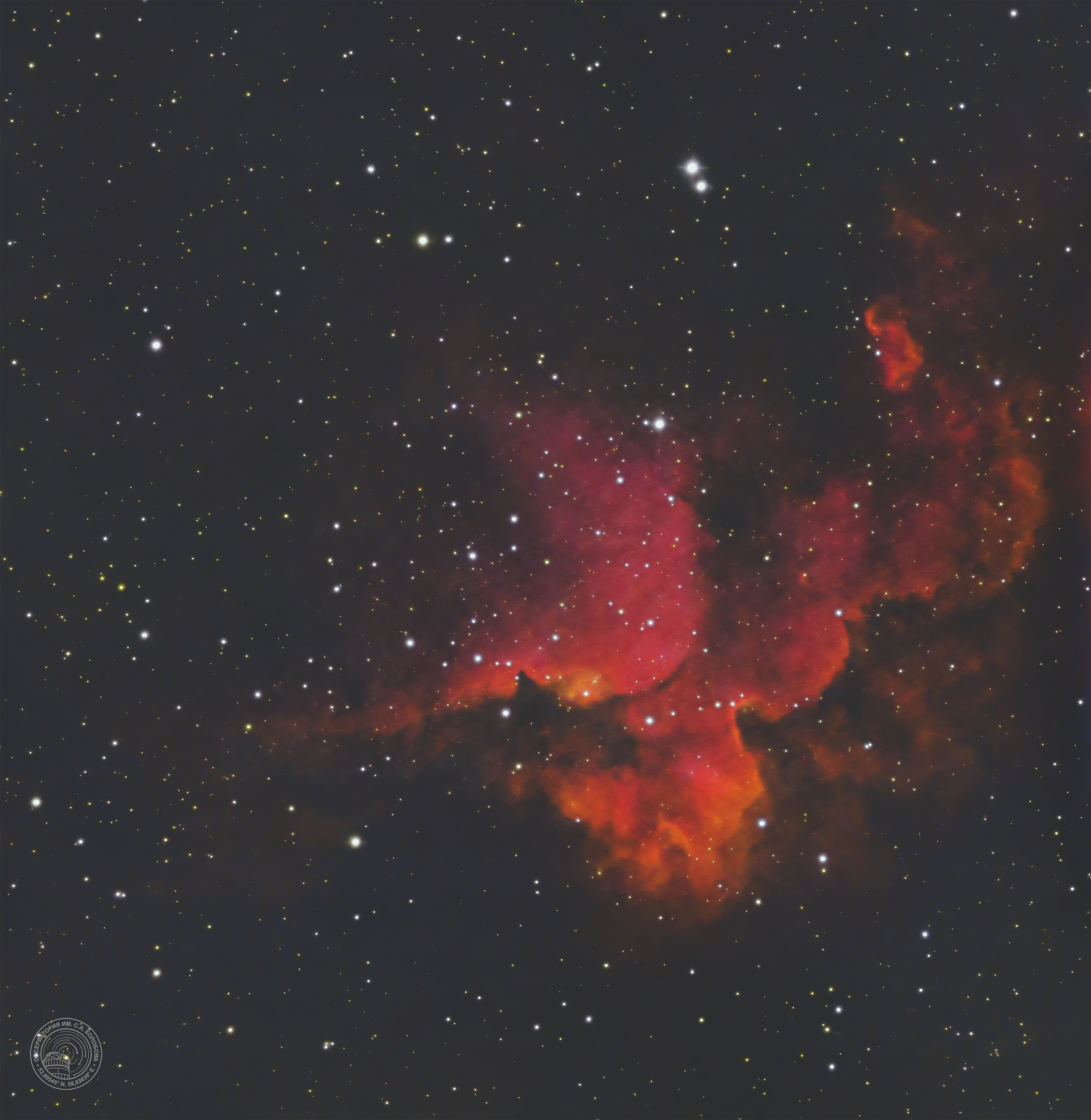 The "Wizard" Nebula NGC 7380 — an open cluster in the constellation Cepheus. The image was captured from 25.06.2025 to 26.06.2025 at the S. A. Kolobov Observatory using an ASTROSIB RC500 telescope on an ASTROSIB AVM-700 mount with an SBIG Aluma AC4040-Ultimate (C2) astrocamera. HSO filters were used, with a total exposure of 120 minutes.