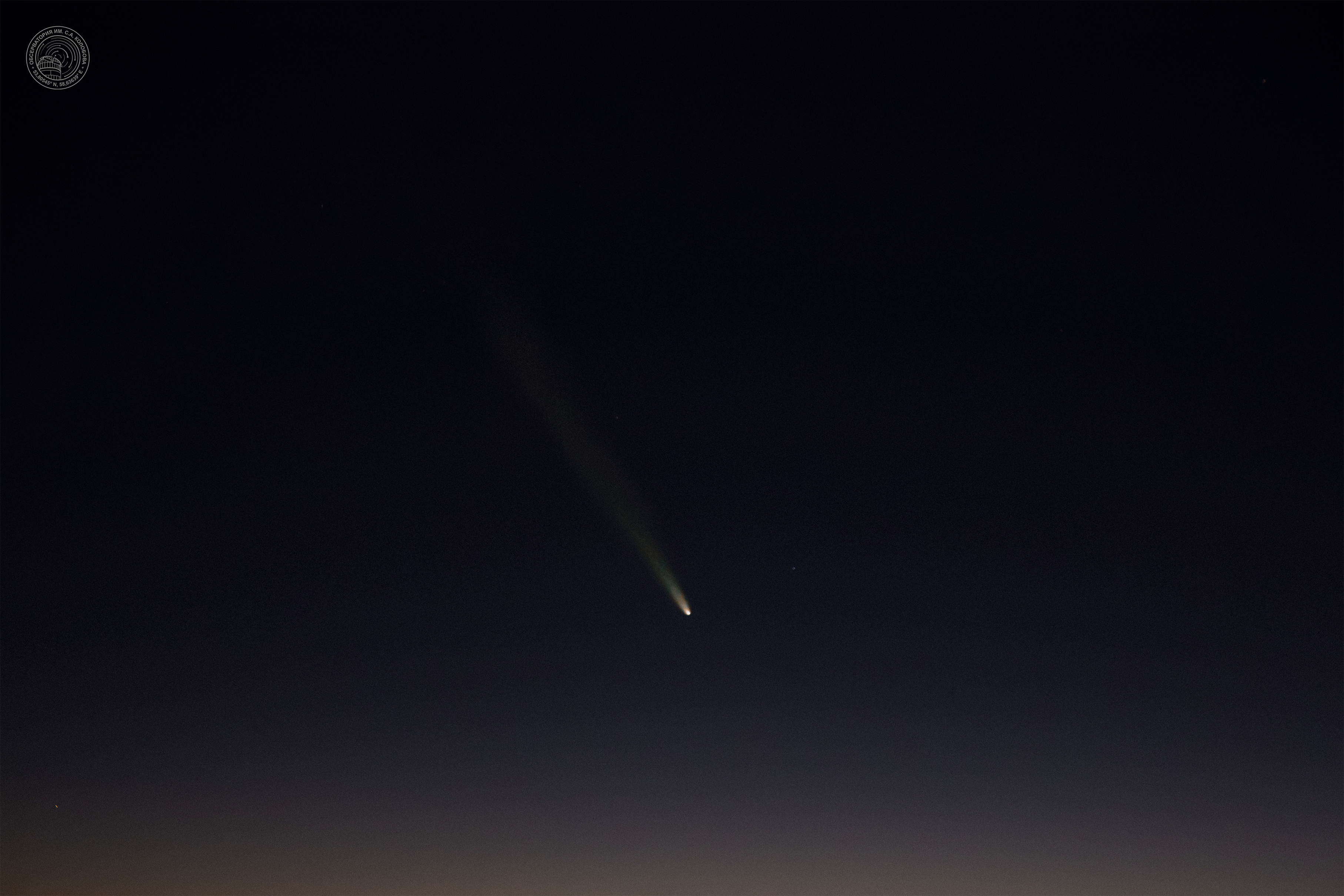 Comet C/2023 A3 (Tsuchinshan — ATLAS). The image was captured using a Canon EOS 550D camera on an AT-1 mount. The result of stacking 10 frames, each with a 10-second exposure. Location: the shore of Lake Muldakkul in the Chelyabinsk region.