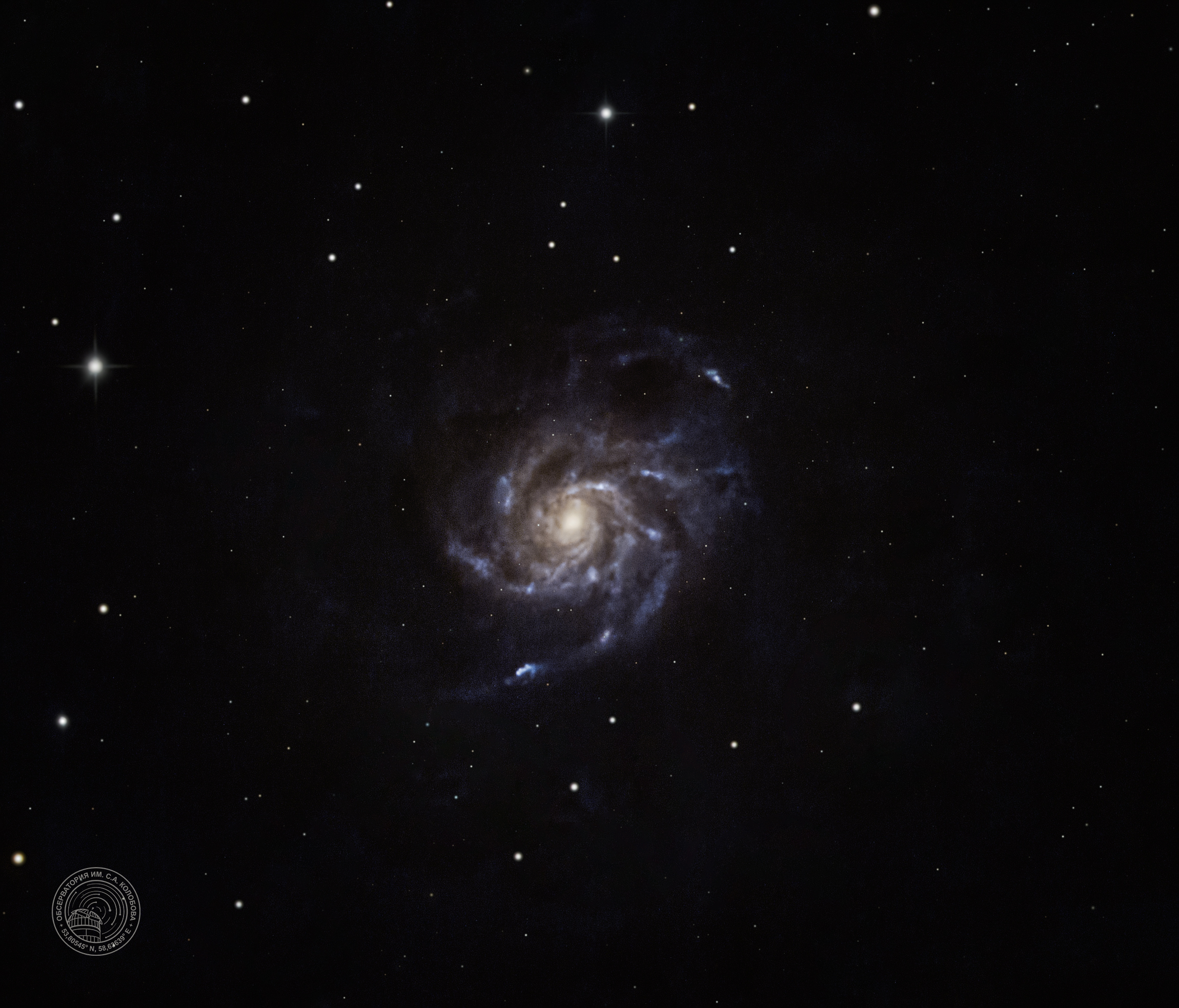 The Pinwheel Galaxy M 101 (NGC 5457) — a spiral galaxy in the constellation Ursa Major. The image was captured on 09.02.2025 at the S. A. Kolobov Observatory using a MEADE LX85 8" F/4 NEWTONIAN ASTROGRAPH OTA telescope on an ASTROSIB AVM-700 mount with a QHY294M-Pro astrocamera. RBV filters were used, with a total exposure of 37 minutes.