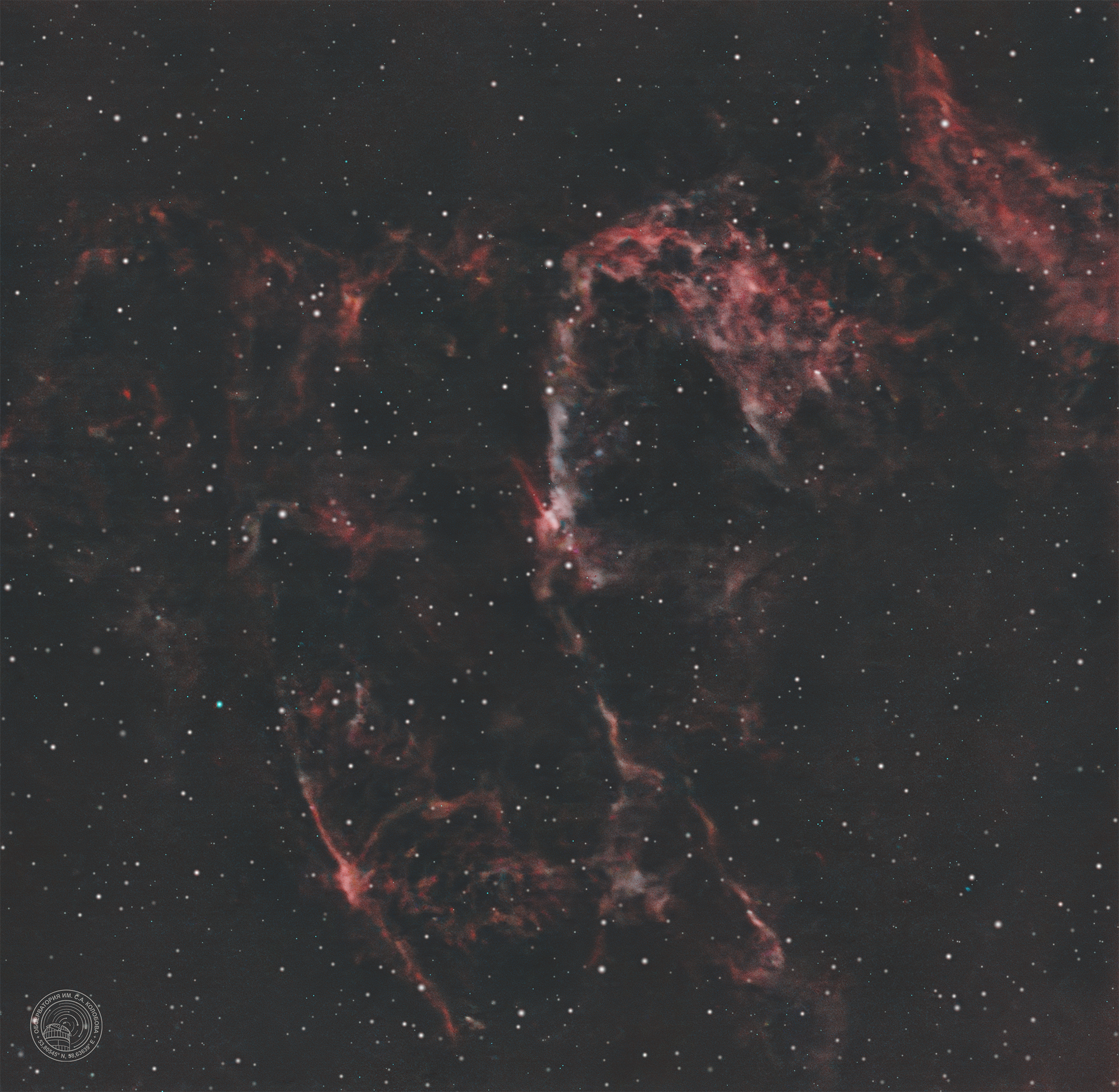 Nebula NGC 6995 — an emission nebula in the constellation Cygnus. It is part of the large Veil Nebula (on the northern side). The image was captured on 29.05.2025 at the S. A. Kolobov Observatory using an ASTROSIB RC500 telescope on an ASTROSIB AVM-700 mount with an SBIG Aluma AC4040-Ultimate (C2) astrocamera. HS filters were used, with a total exposure of 88 minutes.