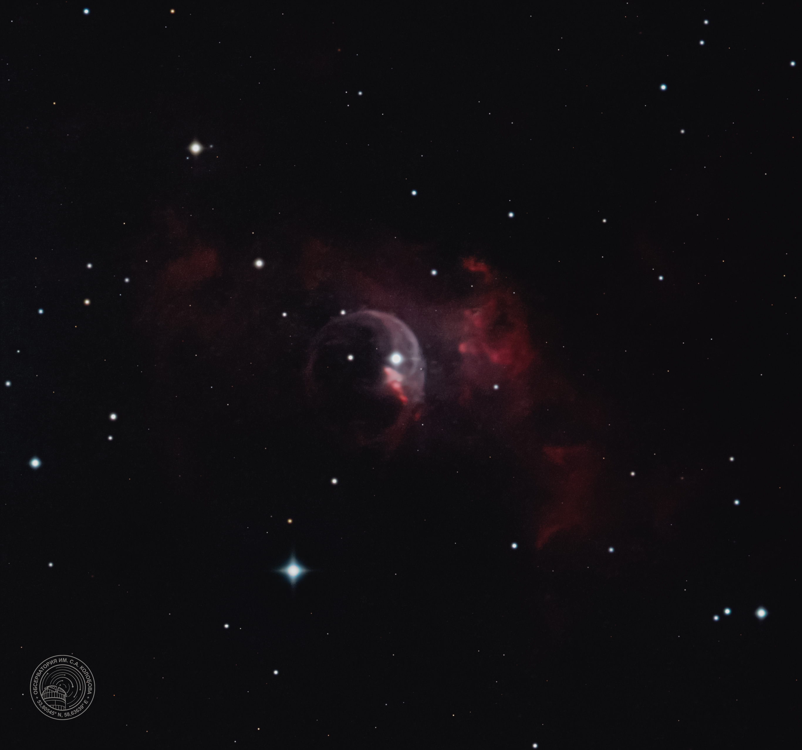 The "Bubble Nebula" NGC 7635 — an emission nebula in the constellation Cassiopeia. The image was captured on 03.09.2024 at the S. A. Kolobov Observatory using an ASTROSIB RC500 telescope on an ASTROSIB AVM-700 mount with an SBIG Aluma AC4040-Ultimate (C2) astrocamera. An RGB filter was used, with a total exposure of 100 minutes.