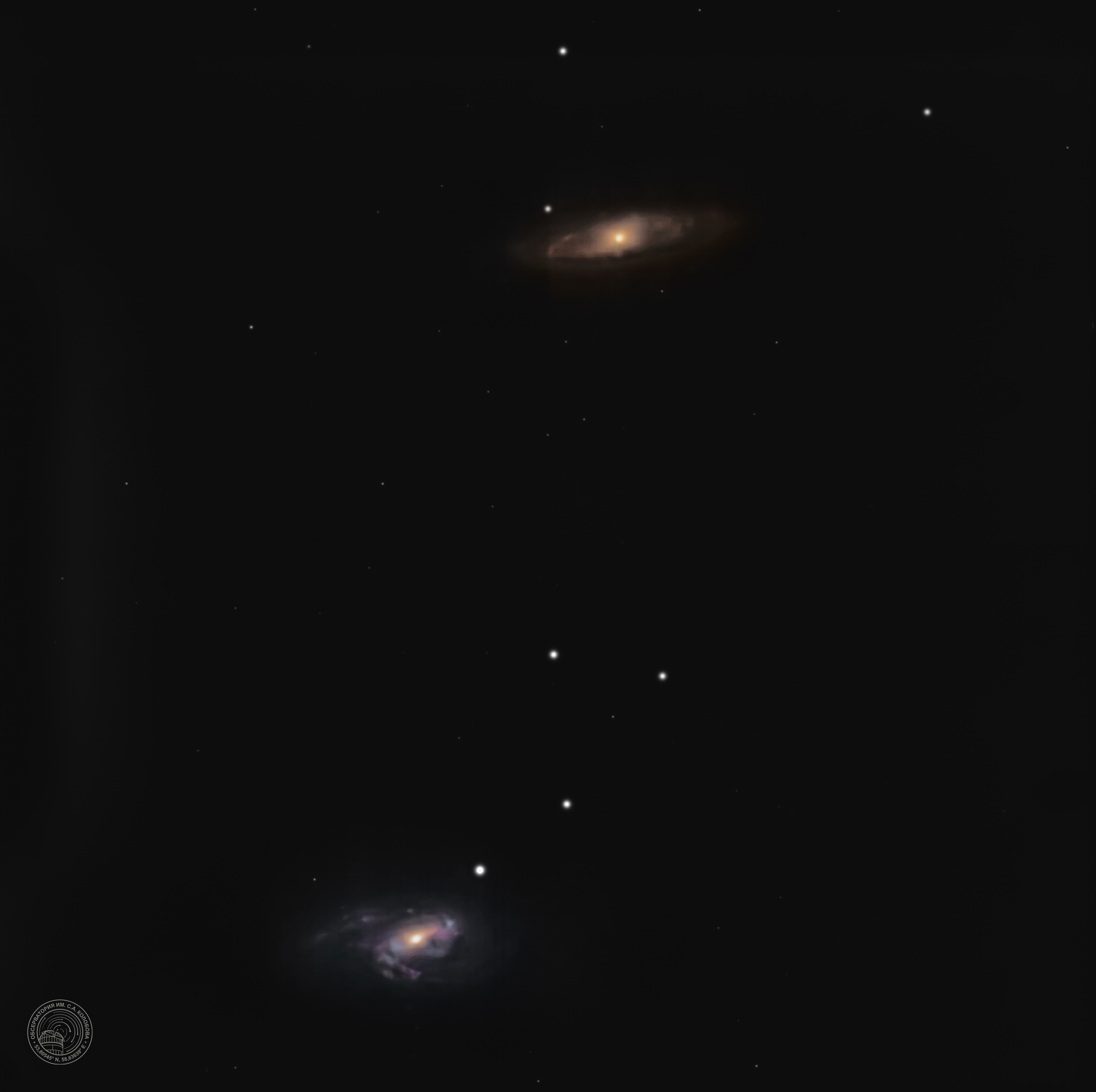 Galaxies M 65 (NGC 3623) and M 66 (NGC 3627). Spiral galaxies in the constellation Leo. The image was captured on 24.03.2025 at the S. A. Kolobov Observatory using an ASTROSIB RC500 telescope on an ASTROSIB AVM-700 mount with an SBIG Aluma AC4040-Ultimate (C2) astrocamera. A Luminance filter was used, with a total exposure of 900 seconds.