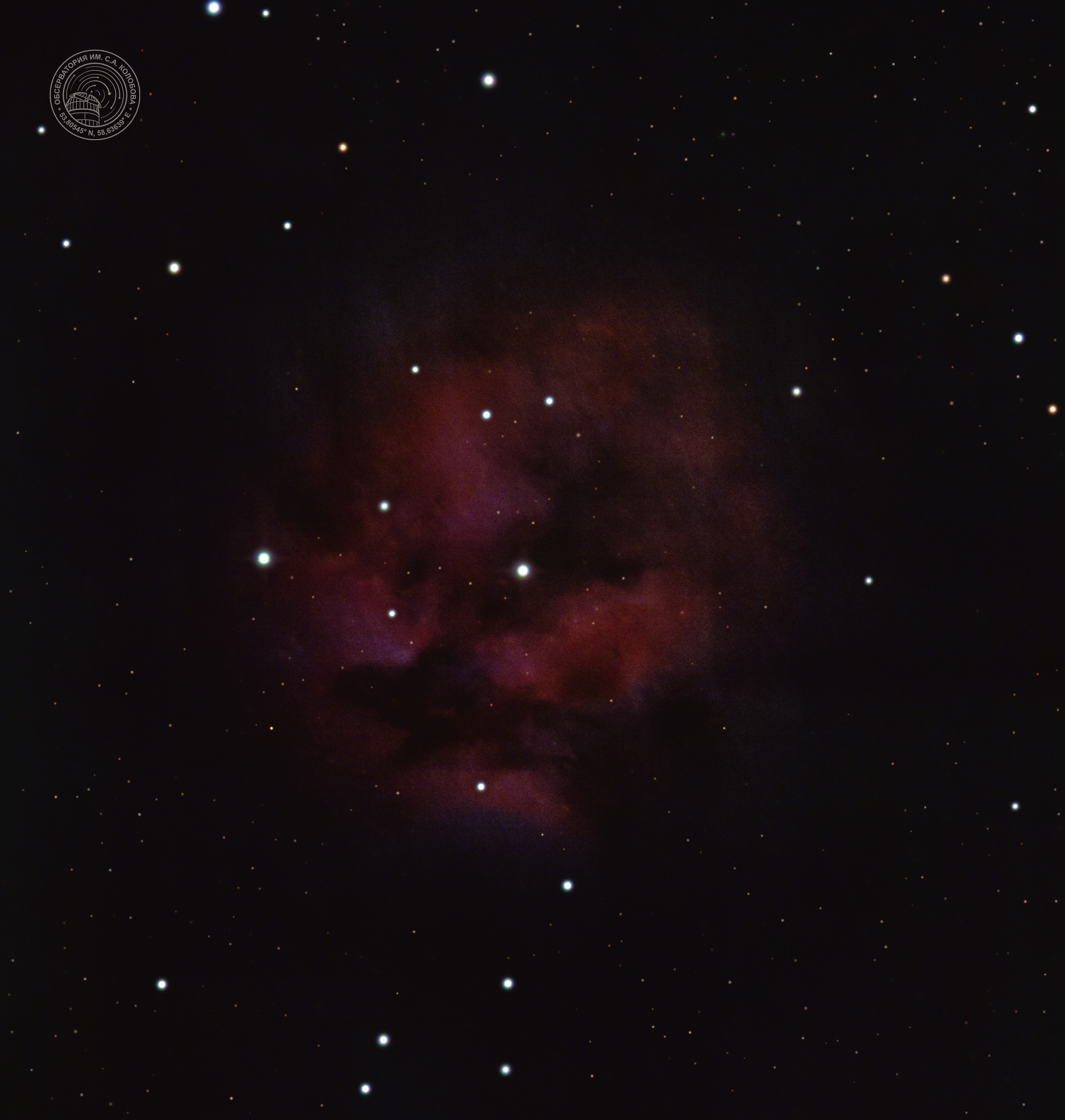The "Pacman Nebula NGC 281" — an emission nebula in the constellation Cassiopeia. It is a region of ionized hydrogen where active star formation is taking place. The image was captured from 23.09.2025 to 26.09.2025 at the S. A. Kolobov Observatory using an ASTROSIB RC500 telescope on an ASTROSIB AVM-700 mount with an SBIG Aluma AC4040-Ultimate (C2) astrocamera. HSO filters were used, with a total exposure of 320 minutes.